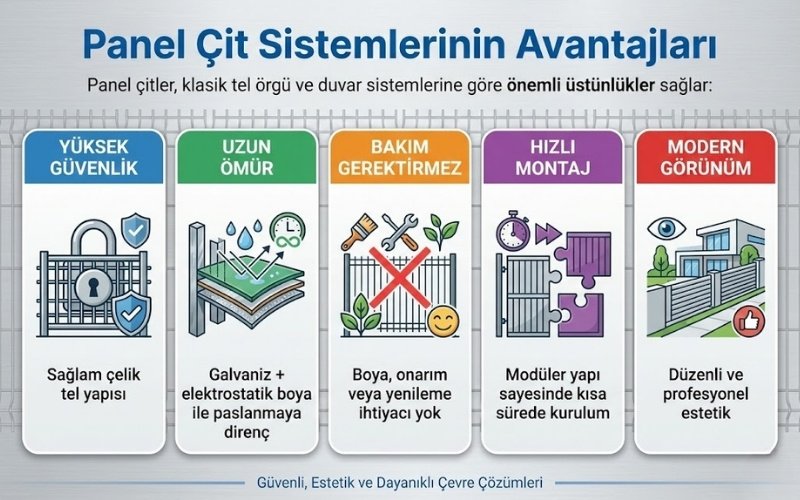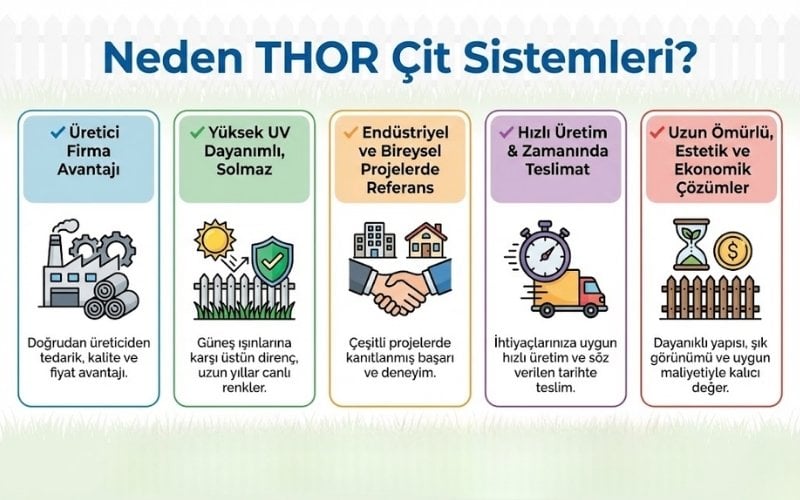 Panel çit sistemleri, dayanıklı, güvenli ve estetik görünümlü çit sistemleridir. Bu haliyle hem bireysel kullanıcılar hem de kurumsal projeler için en ideal çit çözümüdür. Thor Çit Sistemleri olarak yüksek kaliteli malzemeler, farklı model seçenekleri ve profesyonel montaj desteği ile projelerinize değer katıyoruz.